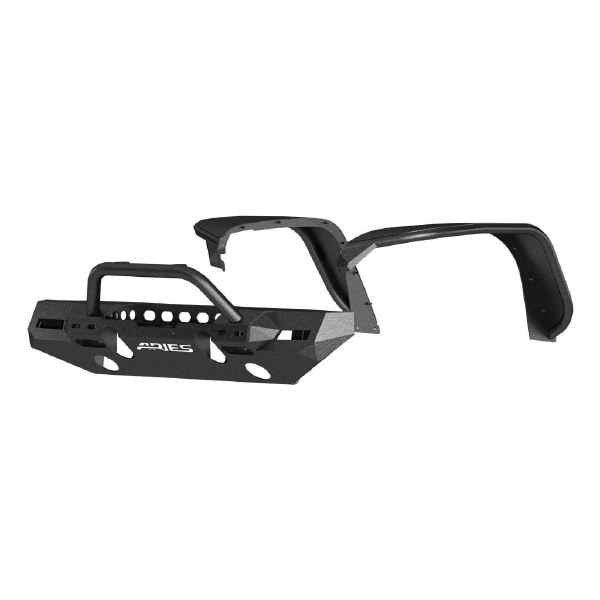 This particular bumper and fender flare kit includes the bumper center section, corner end caps, round center brush guard and front fender flares. The bumper corners feature unique cutouts to integrate the Jeep JL fender flare turn signals when installing the ARIES fender flares. The Jeep fender flares feature a flat profile that is specifically designed to show off larger, offroad tires. They are constructed from lightweight, rust-free aluminum and feature a unique textured black powder coat finish to maximize corrosion resistance and help hide minor scratches and grime.